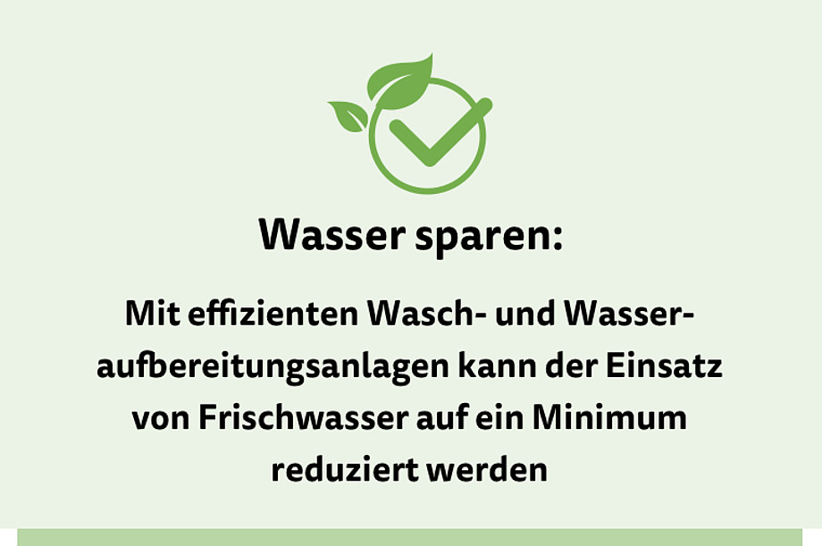 Durch den Einsatz moderner Waschanlagen können wir pro Waschgang bis zu 90 Prozent Frischwasser einsparen, weniger Wasser verbrauchen als eine Waschmaschine und CO2-Emissionen deutlich reduzieren.